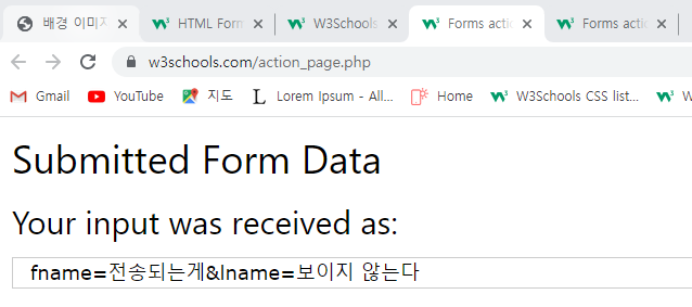 예> 제출할 때 양식 데이터를 "action_page.php"(임의로 지정)로 보낸다.